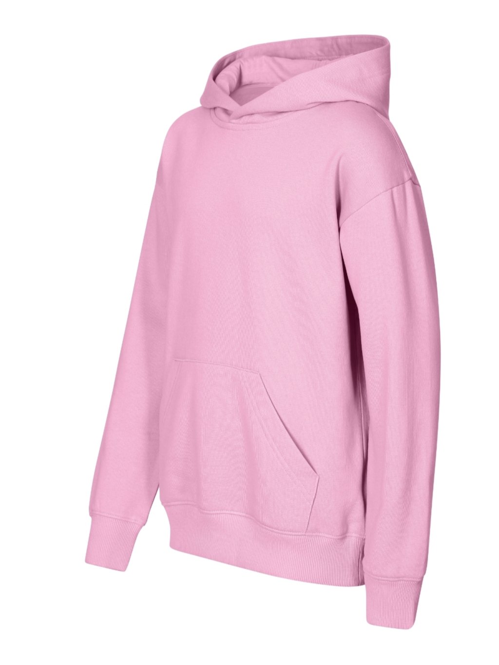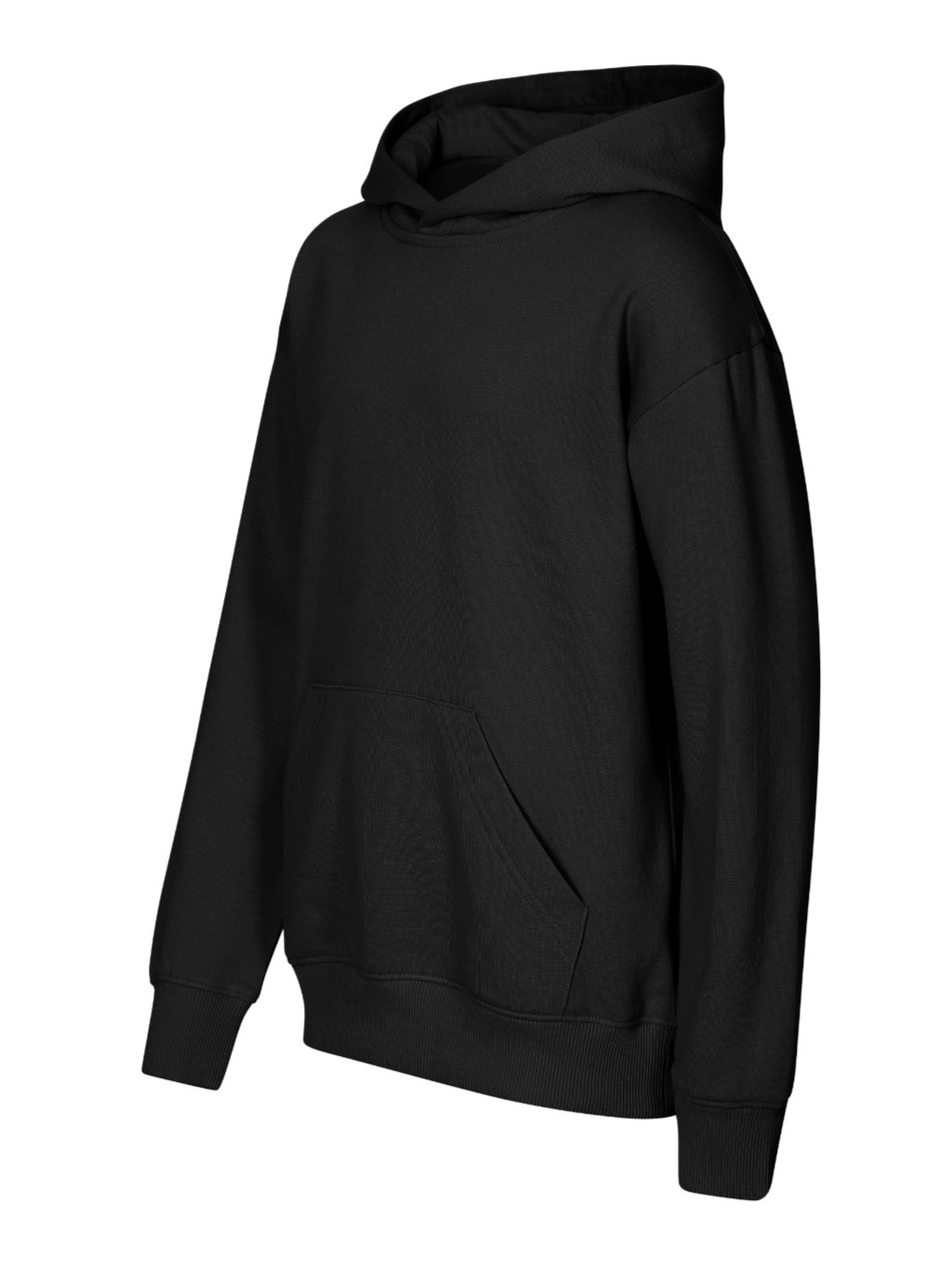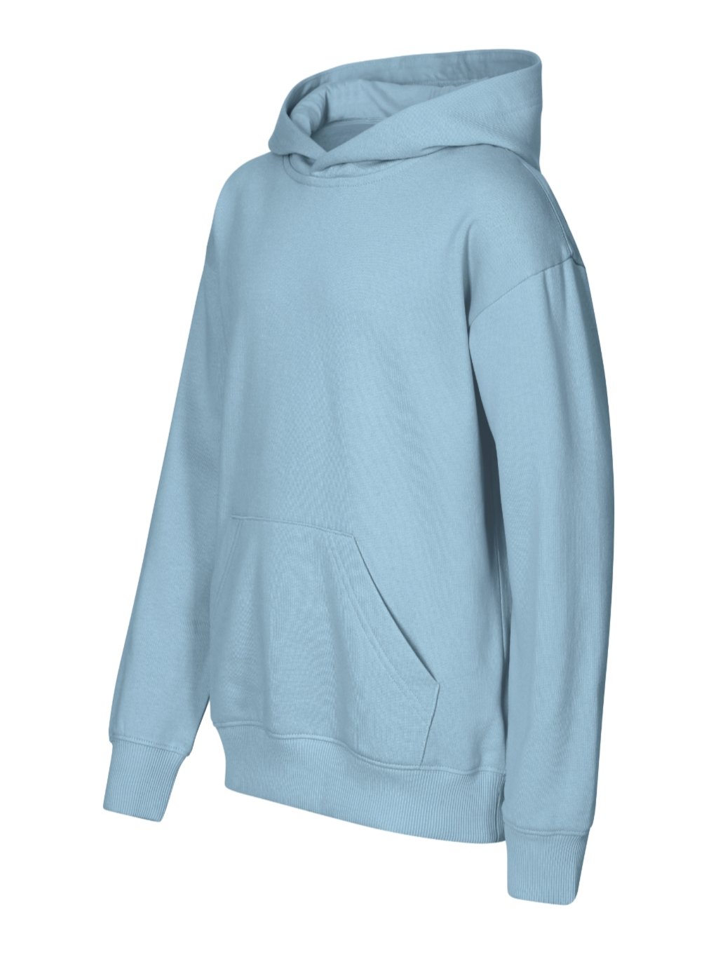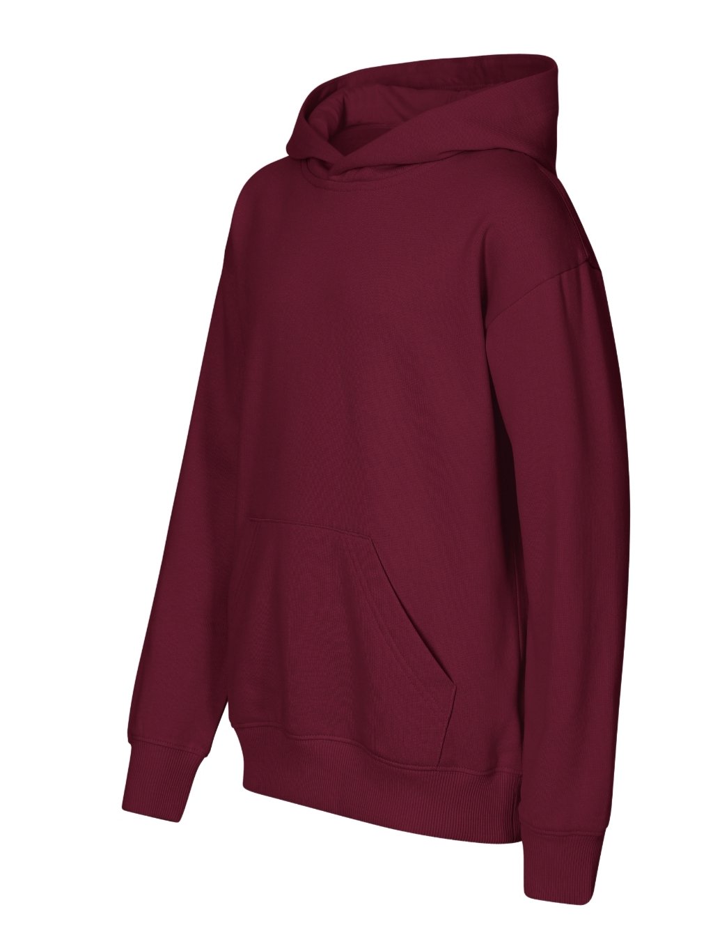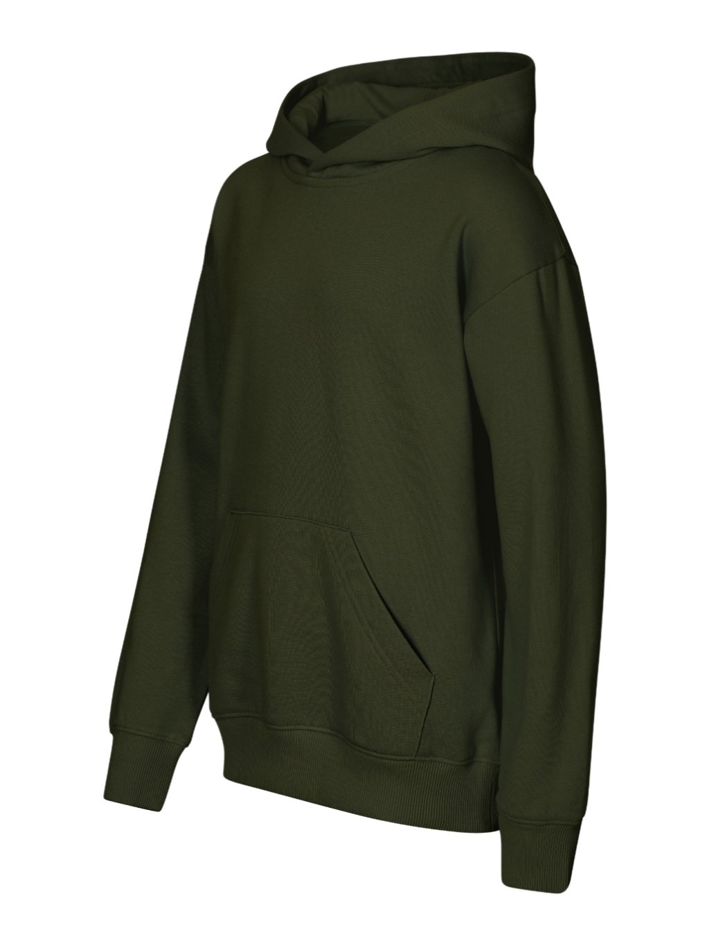 Mikina volného střihu s bočními švy, kapuce s podšívkou, vnitřní část průkrčníku začištěna páskou, nízkohlavicové rukávy, nakládaná kapsa ve stylu klokanky, dolní lem a manžety rukávů z žebrového úpletu 2:2 s 5 % elastanu, vnitřní strana počesaná.
