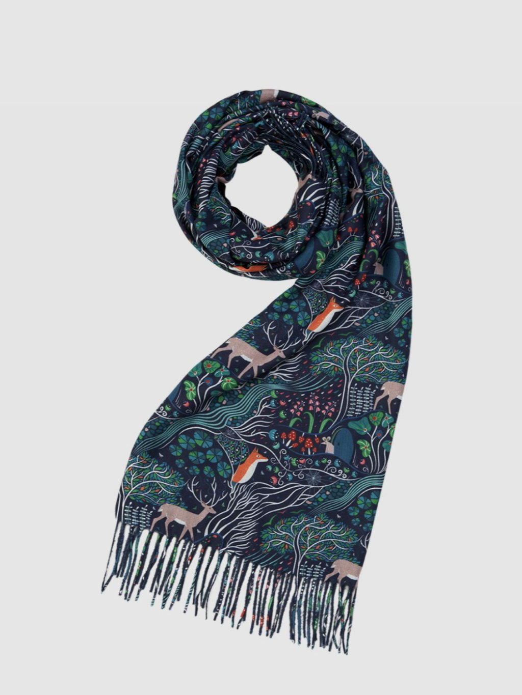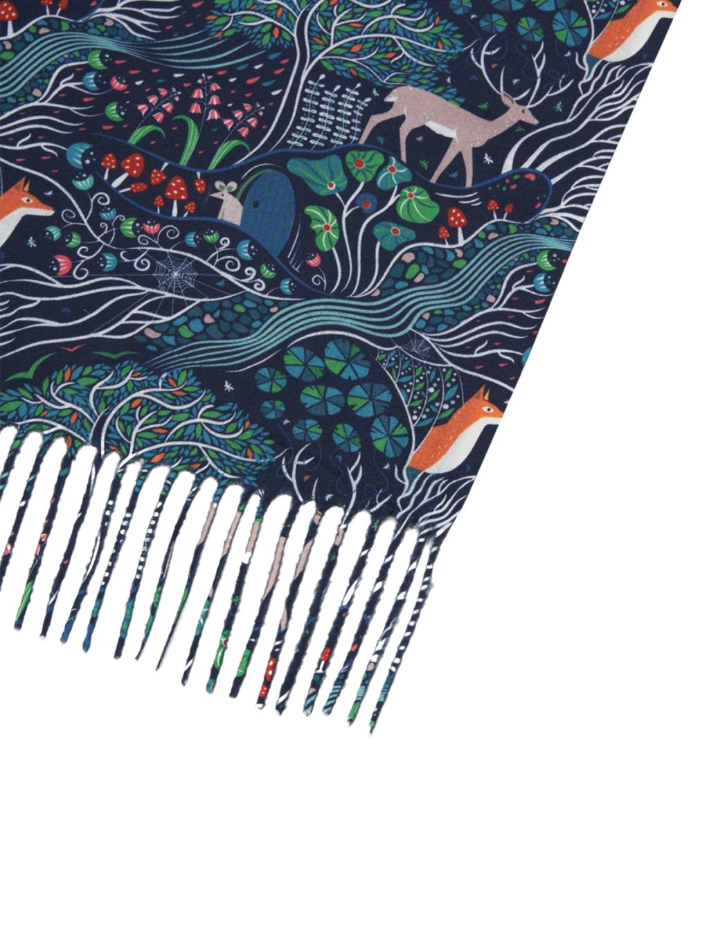 Hřejivý šátek s přírodním tištěným motivem v námořnické modré, který vás zahřeje během chladných dnů, Téma šátku vás zavede do tajemného lesa s čarovnými stromy, liškami, jeleny, myškami a muchomůrkami.
