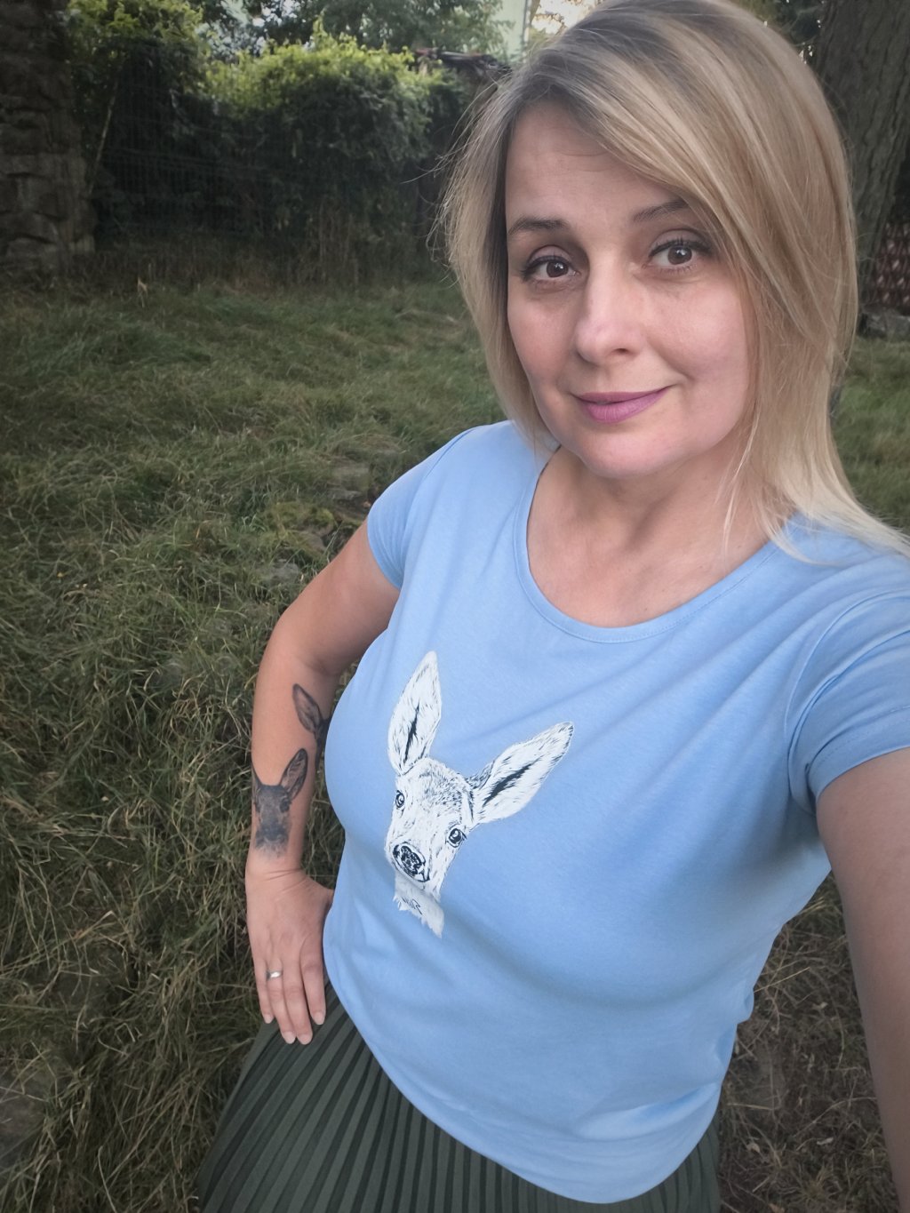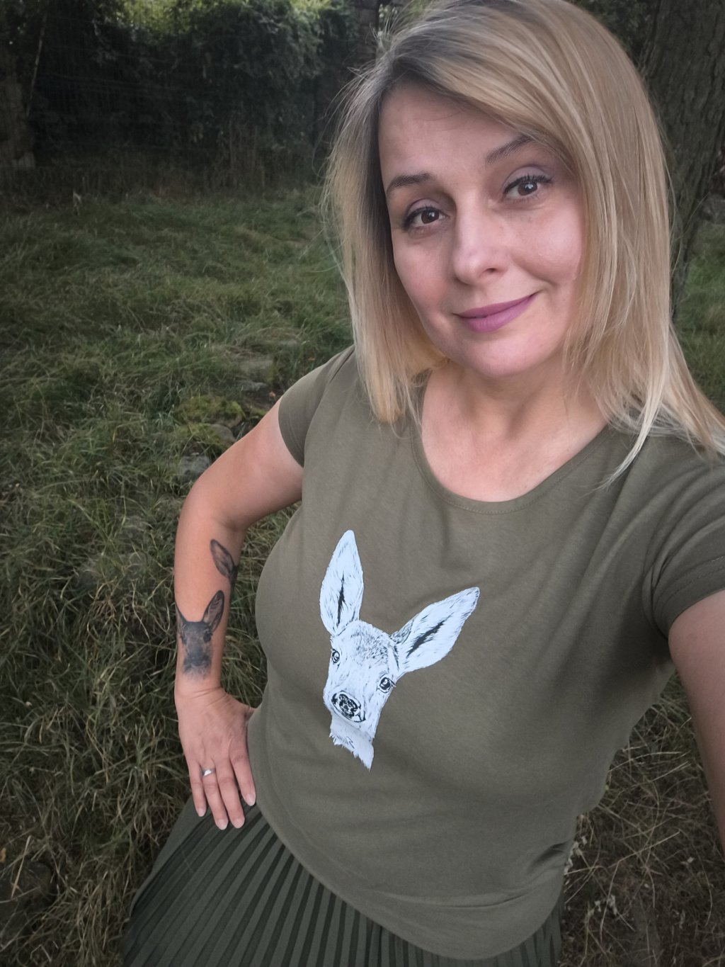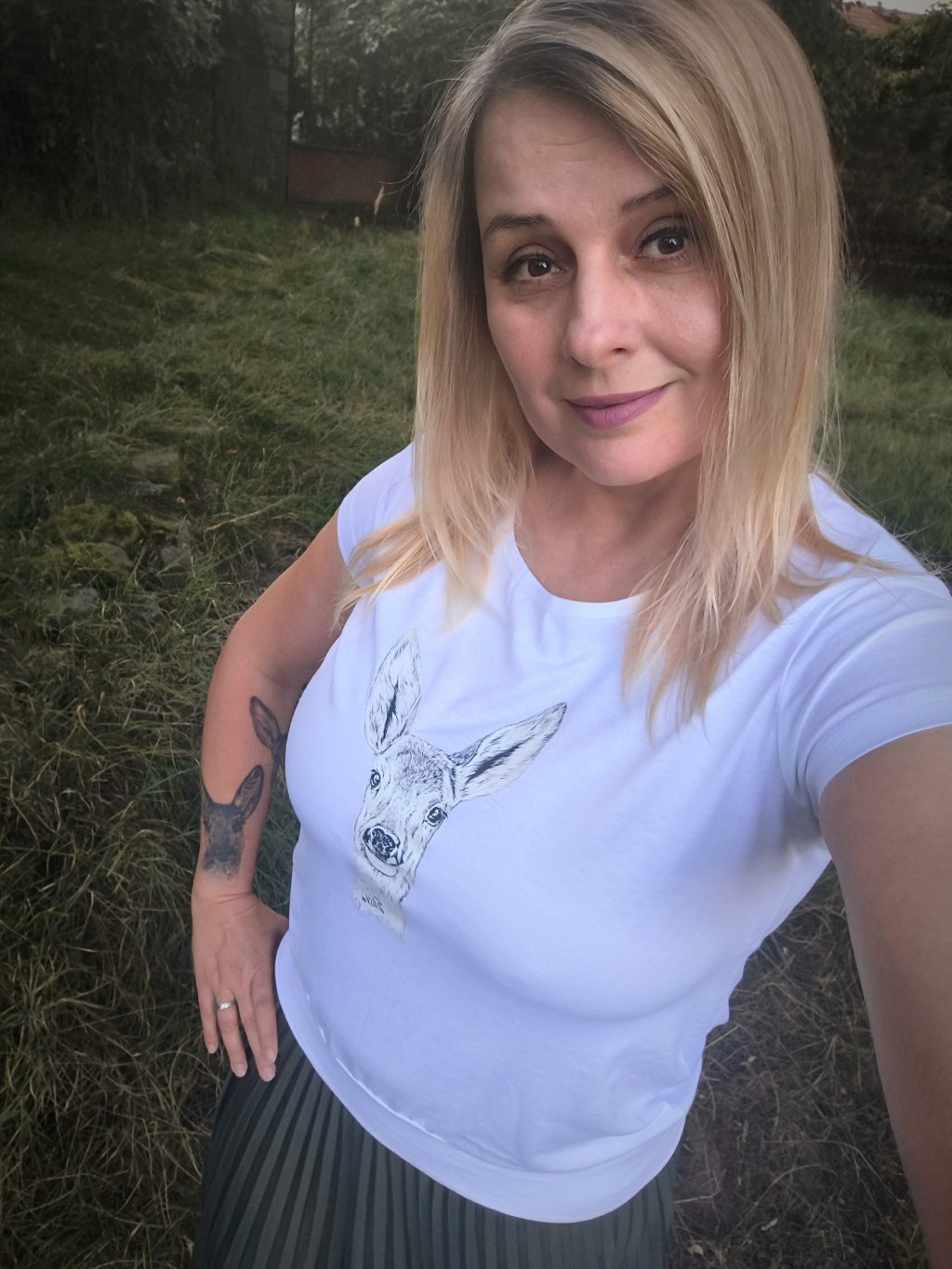 Úžasné dámské bavlněné tričko volného střihu s autorskou perokresbou Elišky, handicapované srnečky. Obrázek je řešen formou nažehlovačky.