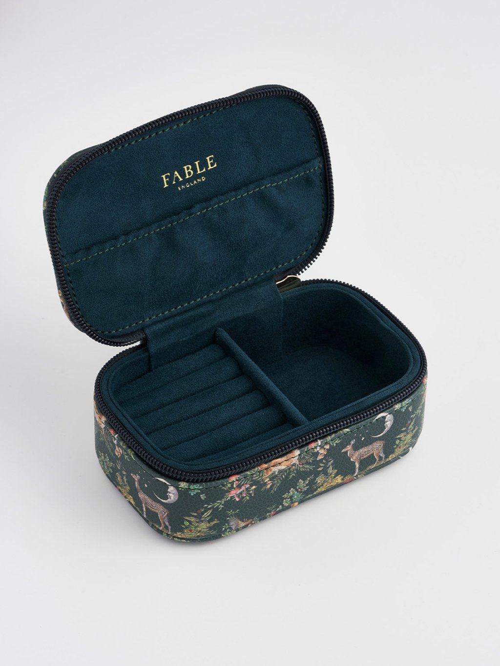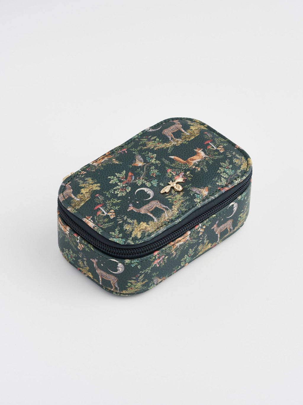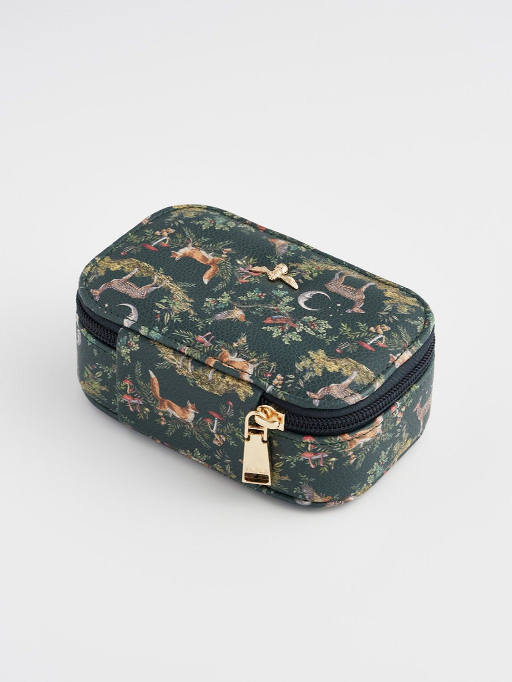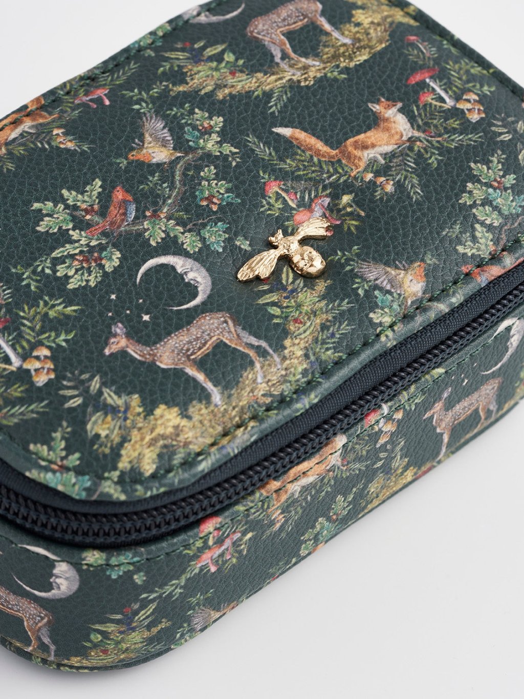 Nádherná šperkovnice v zelené barvě s motivem Do lesa. Vojtíšek, liška, sova ve svitu půlměsíce a kouzelné muchomůrky. Originální kousek, kam můžete schovat šperky a další poklady nejen doma, ale také během cestování.